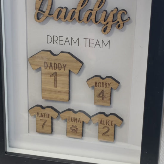 The black box frame measures 32cm x 23cm x 3cm - It features a print that says 'DREAM TEAM' with the addition of a laser cut red acrylic name plaque and Football Shirt pieces with the family's names on.