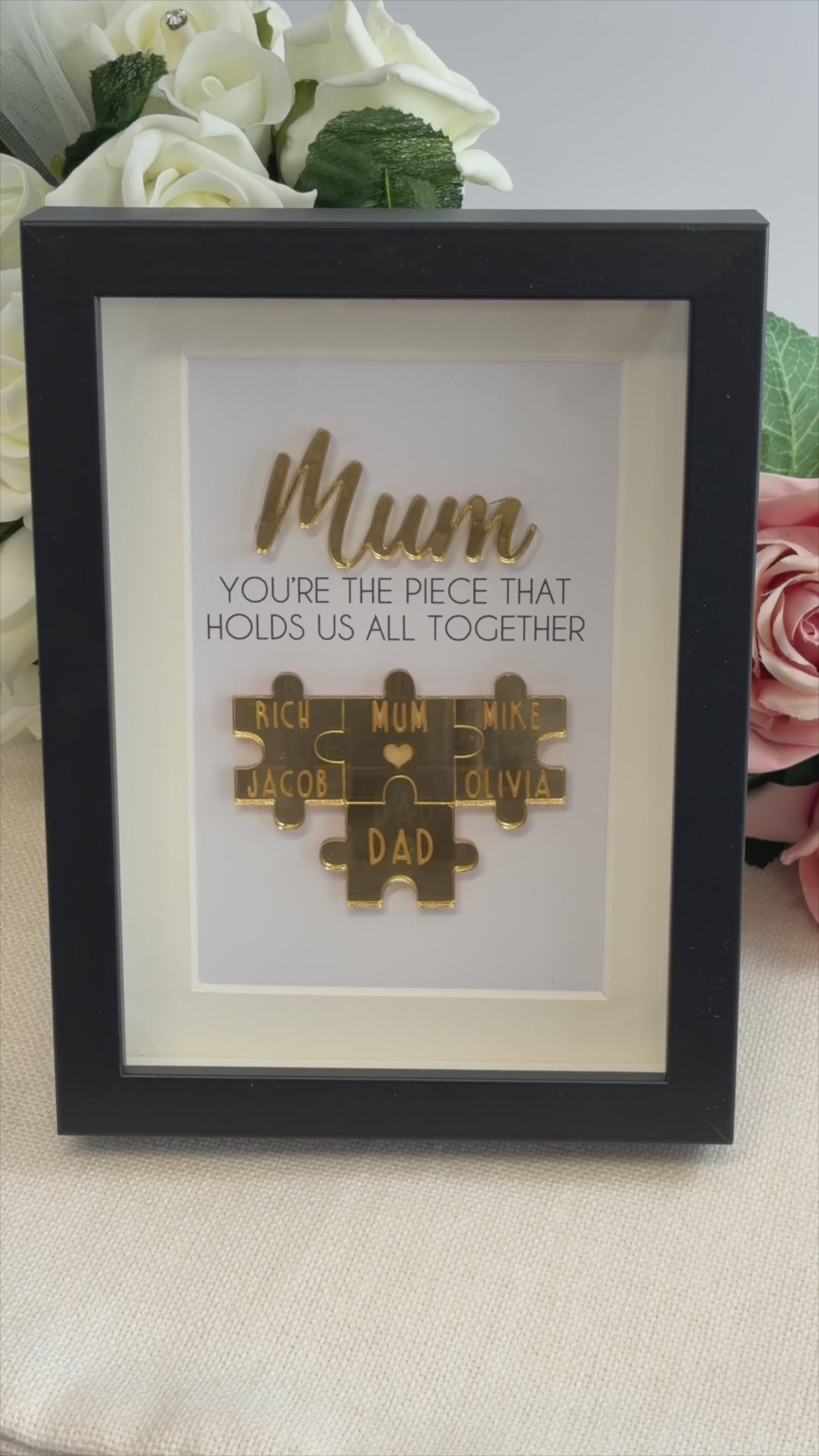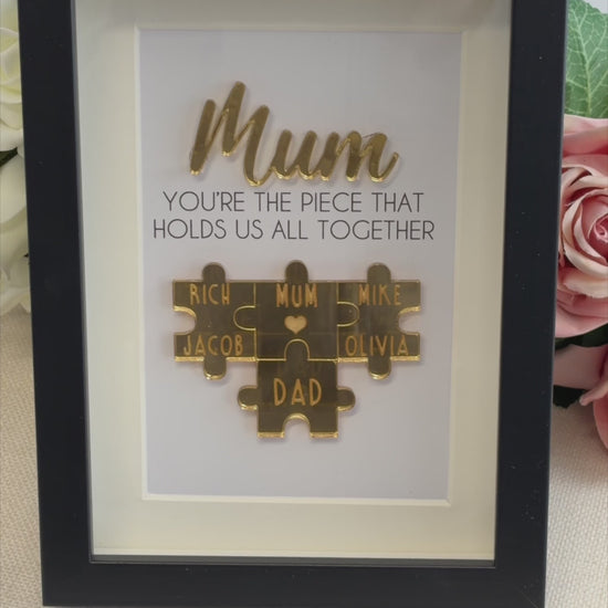 The black box frame measures 20cm x 15cm x 3cm - It features a print that says 'Mum, You're the piece that holds us together' with the addition of a laser cut acrylic name plaque and puzzle pieces with the families name's on.