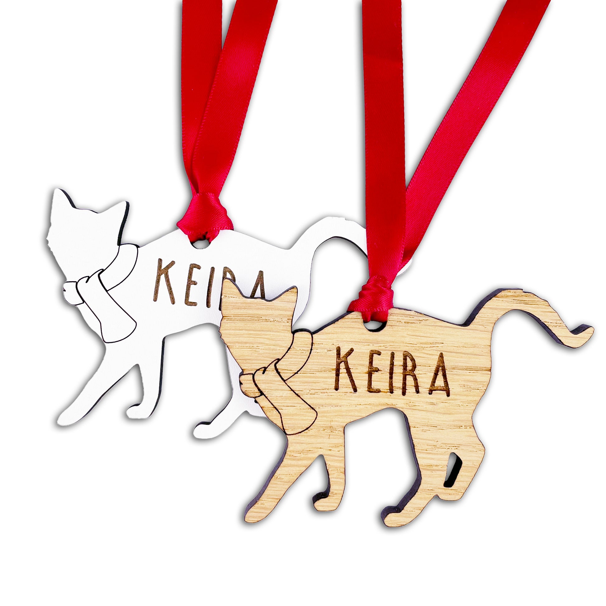 Each of our wooden cat decorations are designed by one of our team and cut with a laser machine to ensure precision. You can choose any name to be engraved onto the decoration, and it comes tied with festive red ribbon to hang on your tree!